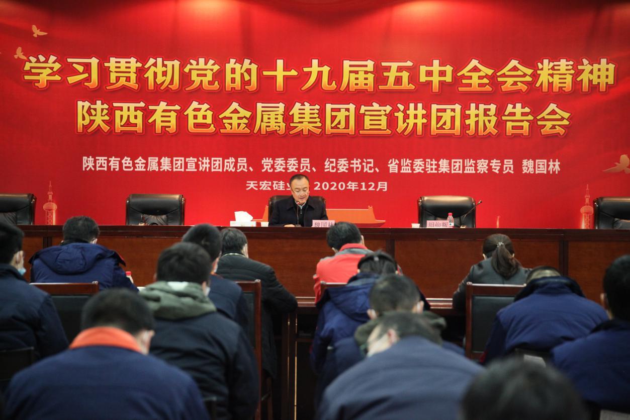 12月4日,學(xué)習(xí)宣傳貫徹黨的十九屆五中全會精神陜西有色金屬集團(tuán)宣講團(tuán)在天宏硅業(yè)進(jìn)行宣講。陜西有色金屬集團(tuán)宣講團(tuán)成員、黨委委員、紀(jì)委書記、省監(jiān)委駐集團(tuán)公司監(jiān)察專員魏國林作宣講報(bào)告。集團(tuán)公司紀(jì)委副書記蘇懷崗、黨委巡察辦主任陳桂瓊等有關(guān)人員參加會議。會議由天宏硅業(yè)黨委書記、董事長胡俊輝主持。