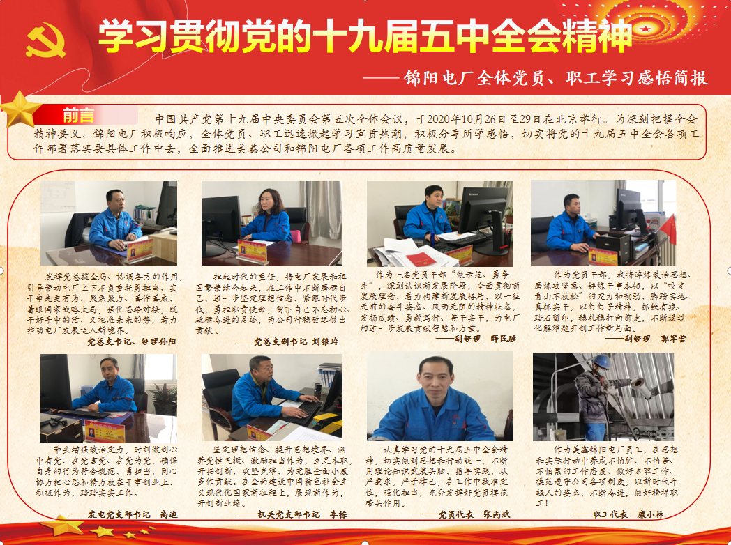 在公司宣講團(tuán)示范下,各基層單位多措并舉提高宣講實效:錦陽電廠黨總支通過動員部署、理論宣講、創(chuàng)辦感悟簡報等形式,指導(dǎo)職工認(rèn)真學(xué)習(xí)領(lǐng)會全會精神;陽極分公司黨總支成立宣講工作組,深入車間、班組一線,推動學(xué)習(xí)貫徹五中全會精神向一線延伸拓展……一場場形式多樣、具體務(wù)實的宣講活動,持續(xù)推動全會精神進(jìn)入思想進(jìn)入一線。