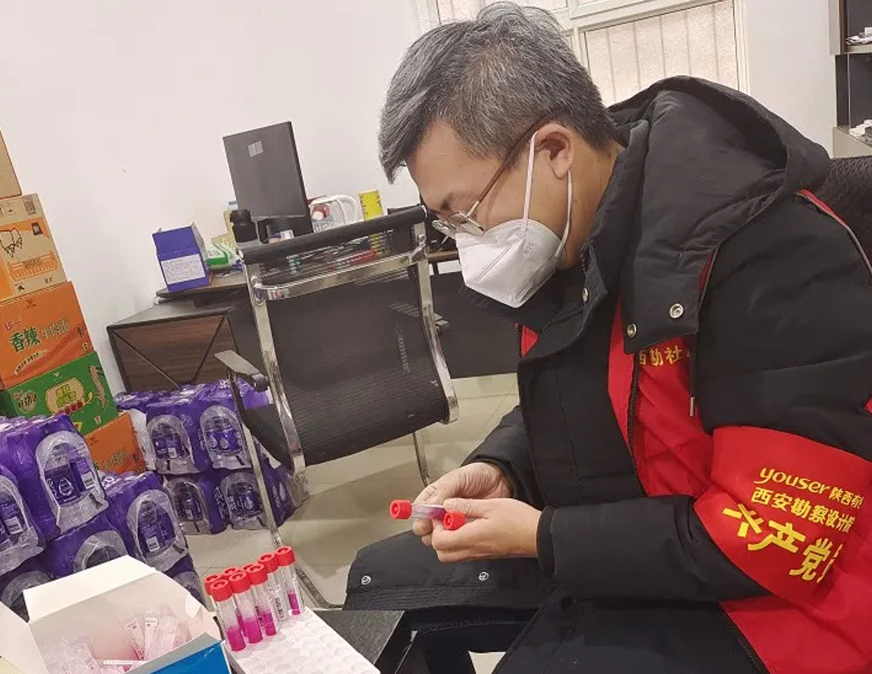 2022年1月1日晚上十一點(diǎn),手機(jī)微信群里突然收到西勘社區(qū)主任李朵的緊急通知:“各位同志,明天的全員核酸篩查要求兩個(gè)小時(shí)內(nèi)完成,我們?nèi)咳藛T都要到位,具體任務(wù)明早統(tǒng)一安排。”2日,八點(diǎn),西勘社區(qū)辦公樓前。所有志愿者和社區(qū)工作人員集結(jié)完畢,李主任做了動(dòng)員講話(huà)?!巴緜?,昨天夜里接到區(qū)政府緊急通知,要求今天早上進(jìn)行新一輪的全員核酸檢測(cè),九點(diǎn)鐘開(kāi)始,必須在十點(diǎn)半前把所有測(cè)試管打包!”大家頓時(shí)感覺(jué)壓力巨大,平時(shí)需要四五個(gè)小時(shí)的時(shí)間,要壓到一個(gè)半小時(shí)內(nèi)完成?!傲硗猓覀兘裉爝€將一個(gè)大組拆分成若干個(gè)小組,分布在小區(qū)幾個(gè)重點(diǎn)區(qū)域進(jìn)行檢測(cè)。針對(duì)這種情況,我們需要大量的志愿者進(jìn)行手機(jī)掃碼登錄,請(qǐng)大家報(bào)名,然后上樓換防護(hù)服,我們只有不到一個(gè)小時(shí)的準(zhǔn)備時(shí)間!”“我參加!”“還有我!”文強(qiáng)、馮滬、馬明、薄紅旺、崔宸瑞率先換好衣服,調(diào)試手機(jī)系統(tǒng),做好掃碼準(zhǔn)備。楊桂英、郭海燕、賈敏、馬美艷四位巾幗也當(dāng)仁不讓?zhuān)頌榇蟀?。穿上紅馬甲的張吉宏、童濤、張彥成、王凱、賀偉、謝春睿已開(kāi)始做物資搬運(yùn)和秩序維護(hù)的準(zhǔn)備。所有人,都深刻感覺(jué)到這是一場(chǎng)大考,如果任務(wù)完不成,就會(huì)延誤社區(qū)乃至整個(gè)雁塔區(qū)的工作節(jié)奏,我們必須全力以赴!