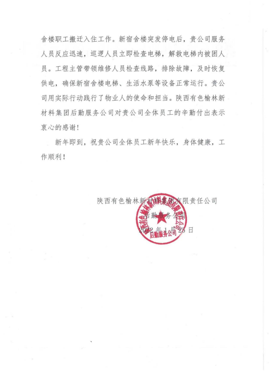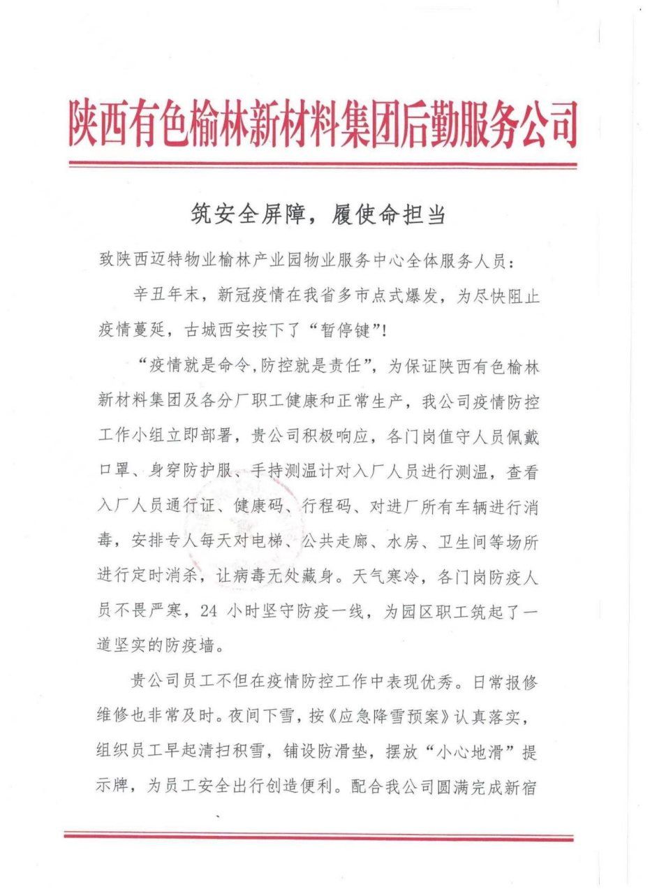 新材料后勤服務(wù)公司的致謝,是對園區(qū)物業(yè)服務(wù)工作的肯定,也是對物業(yè)員工的鼓舞。邁特物業(yè)員工紛紛表示:有付出就有收獲,將更加細化物業(yè)服務(wù)工作,進一步提高服務(wù)品質(zhì),為榆林新材料職工創(chuàng)造舒適、安全、美好的生活環(huán)境。