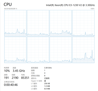 Windows主機中挖礦病毒后的現(xiàn)象如下圖所示(Ctrl+alt+delete打開任務(wù)管理器,選擇“性能”):