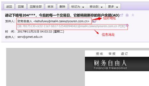 辨別釣魚郵件,首先關(guān)注來郵的地址信息。電子郵件與常規(guī)郵件類似,其發(fā)信人地址可以分為信封地址和信息地址,信封地址是發(fā)件人聲稱的地址,由發(fā)件人自己填寫;而信息地址為郵件服務(wù)器記錄的實際地址。從而可見,信封地址是可以偽造的,而用戶往往看到的就是發(fā)件人的信封地址(可以將光標(biāo)移至發(fā)件人或信封地址后面查看是否有地址不一致的提示)。一般來說一封正常的電子郵件應(yīng)該是信息地址和信封地址是相同的,如果不同,或標(biāo)記“代發(fā)”的,就要特別小心,可以初步判斷可能是一封偽造郵件,也就是可能是釣魚郵件。例如以下這封郵件: