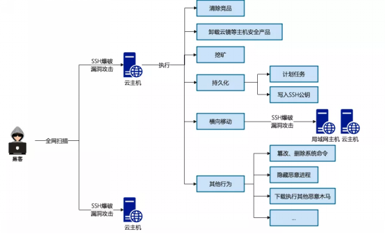 挖礦木馬會(huì)占用CPU進(jìn)行超頻運(yùn)算,從而占用主機(jī)大量的CPU資源,嚴(yán)重影響服務(wù)器上的其他應(yīng)用的正常運(yùn)行。黑客為了得到更多算力資源,一般都會(huì)對(duì)全網(wǎng)進(jìn)行無(wú)差別掃描,同時(shí)利用SSH爆破和漏洞利用等手段攻擊主機(jī)。