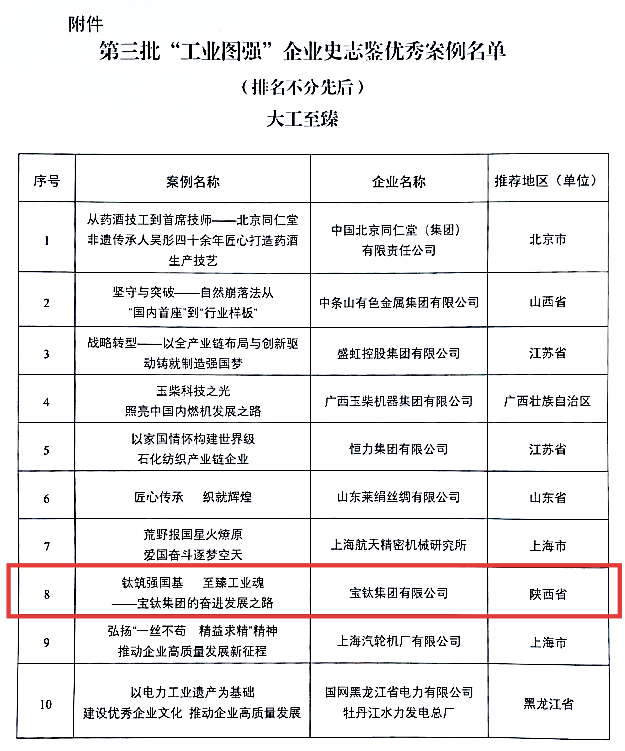 經(jīng)前期認(rèn)真籌備,近日,寶鈦集團(tuán)成功入選工信部工業(yè)文化發(fā)展中心第三批“工業(yè)圖強(qiáng)”企業(yè)史志鑒優(yōu)秀案例名單。