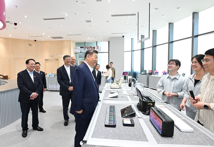 4月29日,中共中央總書記、國家主席、中央軍委主席習近平在上海考察。這是習近平在位于徐匯區(qū)的上?!澳K倏臻g”大模型創(chuàng)新生態(tài)社區(qū)人工智能產(chǎn)品體驗店考察。新華社記者 謝環(huán)馳 攝
