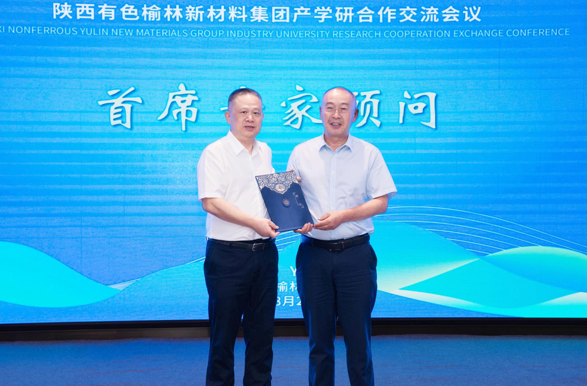 楊國平代表榆林新材料集團向郭學(xué)益頒發(fā)首席專家顧問聘書。
