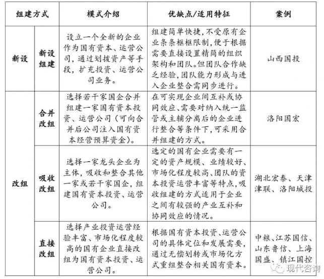國發(fā)〔2018〕23號文件規(guī)定,按照國家確定的目標(biāo)任務(wù)和布局領(lǐng)域,國有資本投資、運(yùn)營公司可采取新設(shè)和改組兩種方式設(shè)立。其中新設(shè)組建是指設(shè)立一個全新的企業(yè)作為國有資本投資運(yùn)營公司,通過劃撥資產(chǎn)等手段,擴(kuò)充投資、運(yùn)營公司業(yè)務(wù);改組組建是指選擇具備一定條件的國有獨(dú)資企業(yè)集團(tuán)改組成立,但是在具體操作中,改組方式又可以細(xì)化為合并改組、吸收改組和直接改組。