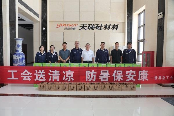 夏日天氣炎炎,氣溫節(jié)節(jié)攀升,7月19日,佳縣總工會(huì)人大副主任、工會(huì)主席李占明一行來(lái)陜西有色天瑞硅材料公司開(kāi)展夏季“送清涼”慰問(wèn)活動(dòng)。