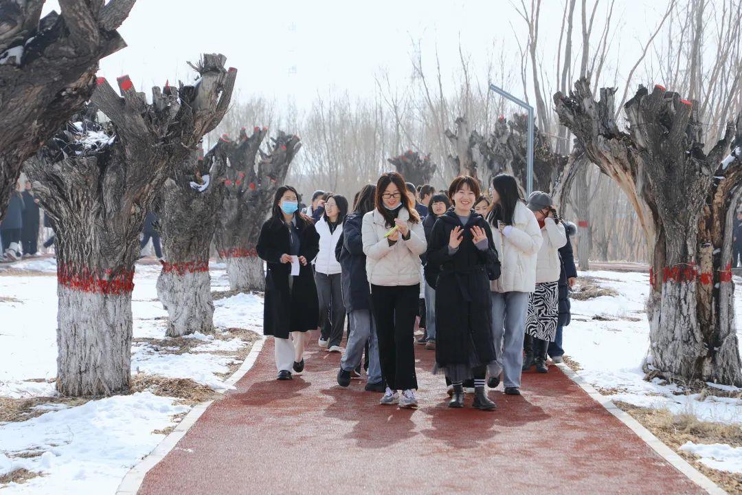 全程2公里的環(huán)湖步道化身為健康長(zhǎng)廊,一夜春雪簌簌,道路兩旁積雪堆疊,滿是大自然饋贈(zèng)的浪漫與詩(shī)意。女職工們?nèi)宄扇航Y(jié)伴,既有你追我趕的活力比拼,也有駐足留影的歡聲笑語(yǔ)。沿途設(shè)立的打卡拍照點(diǎn)和兩個(gè)"能量補(bǔ)給站"貼心提供姜汁可樂、小零食,為奮進(jìn)的腳步注入滿滿元?dú)?。本次活?dòng)創(chuàng)新融入趣味挑戰(zhàn)元素,“不服來(lái)Battle”“奔跑小分隊(duì)”“圓舞曲”“步步為贏”等四大主題游戲互動(dòng)沿步道分布。女職工們?cè)谶\(yùn)動(dòng)間隙參與挑戰(zhàn),熱情高漲。